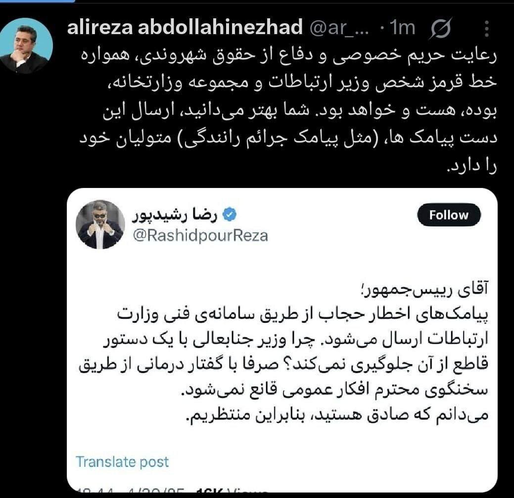 رویداد ۲۴| علیرضا عبداللهینژاد، رئیس روابط عمومی وزارت ارتباطات در پاسخ به ادعای استفاده از سامانههای فنی وزارت ارتباطات در ارسال اخطار حجاب، نوشت: «رعایت حریم خصوصی و دفاع از حقوق شهروندی، همواره خط قرمز شخص وزیر ارتباطات و مجموعه وزارتخانه، بوده، هست و خواهد بود.