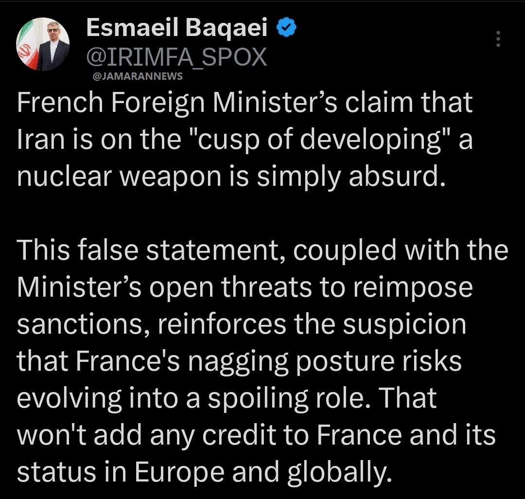 بقایی سخنگوی وزارت امور خارجه کشورمان نوشت: ادعای وزیر امور خارجه فرانسه مبنی بر اینکه ایران در «آستانه توسعه» سلاح هستهای است، کاملاً پوچ و بیاساس است.
