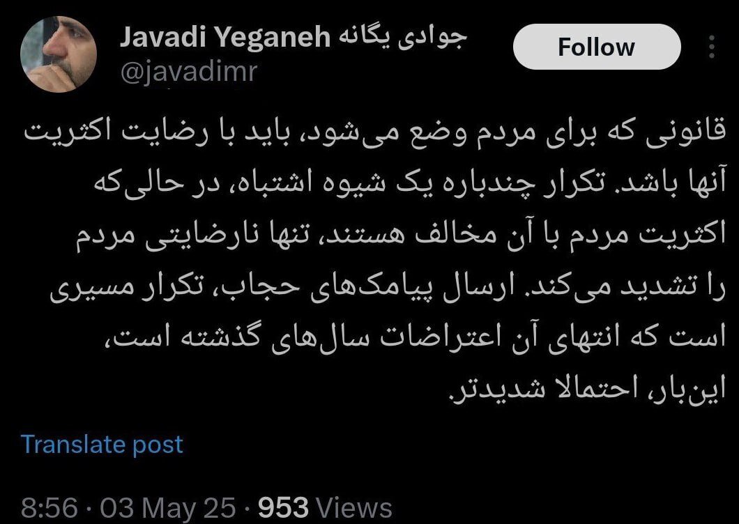 رویداد۲۴| جوادی یگانه مشاور نهاد ریاست جمهوری، درمورد پیامکهای حجاب در شبکه اجتماعی ایکس نوشت:
