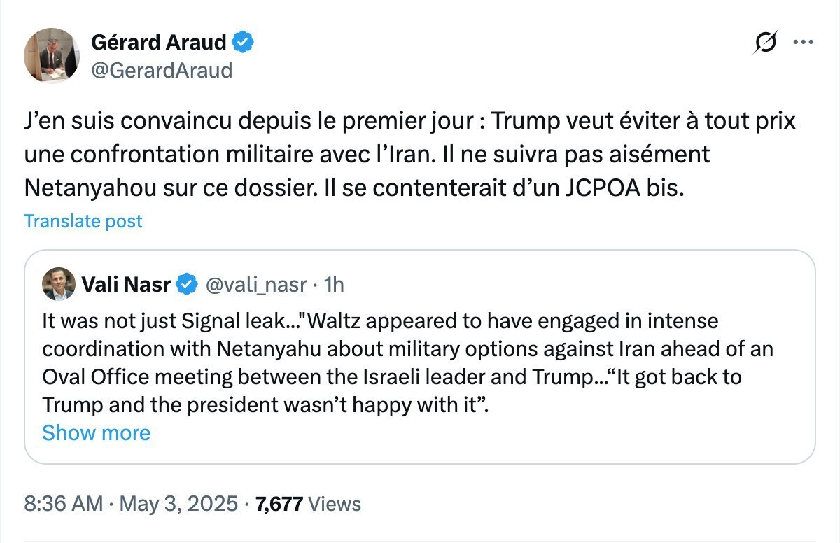 ژرار آرود در شبکه ایکس نوشت: «من از روز نخست مطمئن بودم که ترامپ میخواهد به هر قیمتی از رویارویی نظامی با ایران جلوگیری کند. او بهراحتی از نتانیاهو در این پرونده پیروی نمیکرد و به یک توافق شبیه "برجام" رضایت میداده است.»