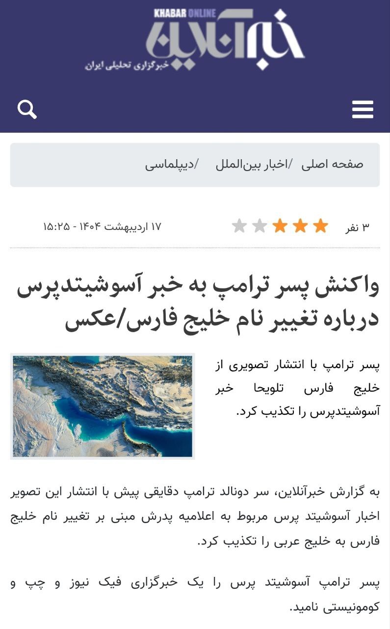در ساعات پیش مطلبی در خبرگزاریها با عنوان اینکه «پسر ترامپ خبر آسوشیتدپرس درباره تغییر نام خلیج فارس توسط دونالد ترامپ را تکذیب کرد»، منتشر شده که صحت ندارد.