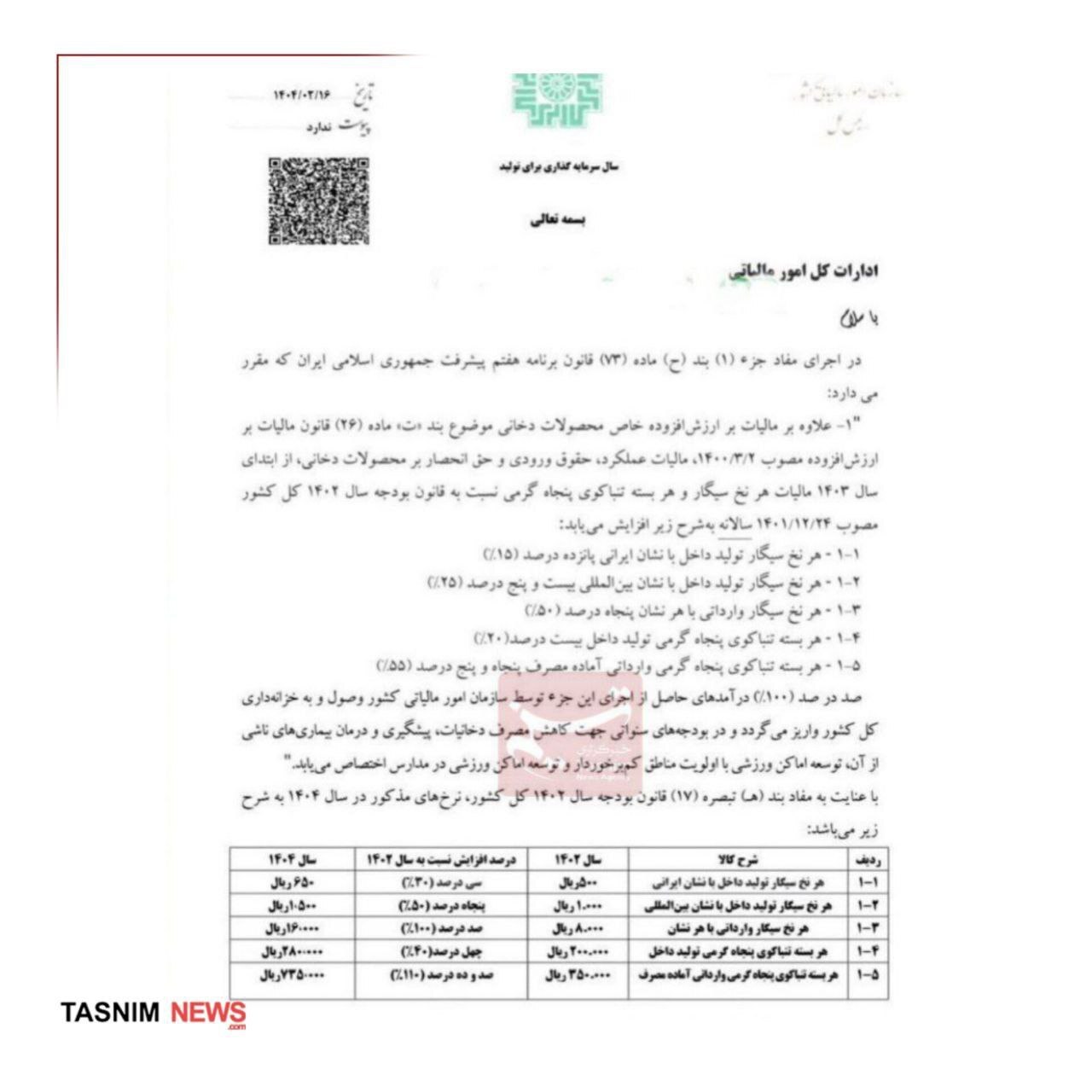 رویداد۲۴| سیدهادی سبحانیان، رئیسکل سازمان امور مالیاتی کشور، طی بخشنامهای خطاب به گمرکات اجرایی، نرخ مالیات و عوارض ارزش افزوده انواع سیگار و محصولات دخانی در سال ۱۴۰۴ را اعلام کرد. این ابلاغیه با استناد به جزء «یک بند ح» ماده ۷۳ قانون برنامه هفتم توسعه صادر شده است.