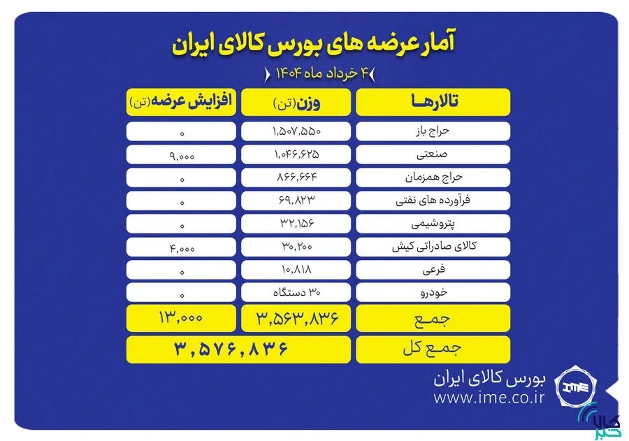 رویداد۲۴| امروز یکشنبه ۴ خرداد ماه در تالارهای بورس کالای ایران ۳ میلیون و ۵۷۶ هزار و ۸۳۶ تن انواع محصول عرضه میشود.