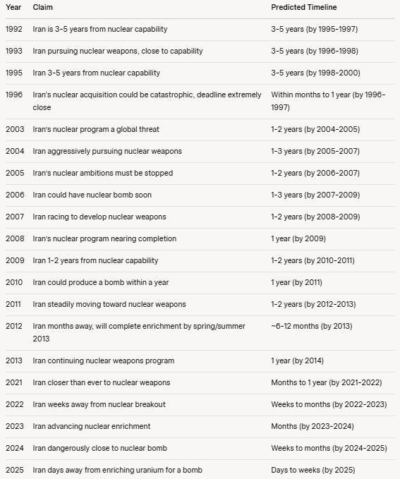 تصویری از تایملاین ادعای اسرائیل درباره نزدیک شدن ایران به بمب اتمی از سال ١٩٩٢ تا امروز را مشاهده میکنید.
