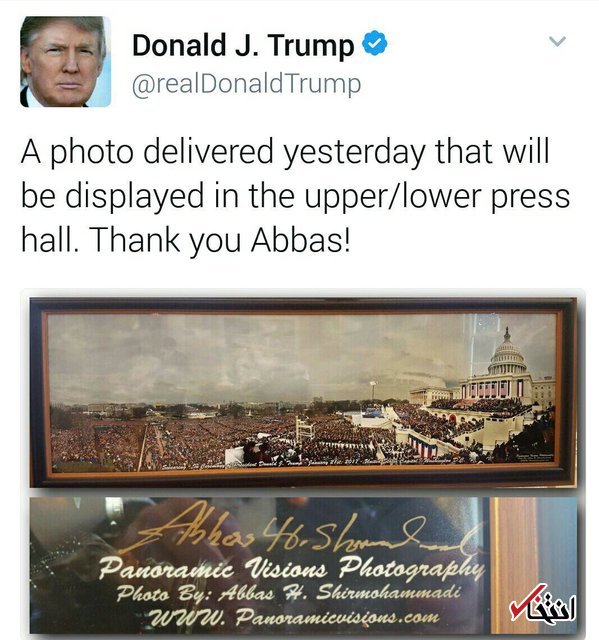 رییس‌جمهوری آمریکا در توییتی از عکاس ایرانی بابت عکسی که از مراسم تحلیف او گرفت، تشکر کرده است. دونالد ترامپ در توئیتر خود از عباس شیرمحمدی، عکاس ایرانی‌تبار برای عکسی که از مراسم تحلیف گرفته تشکر کرده است.