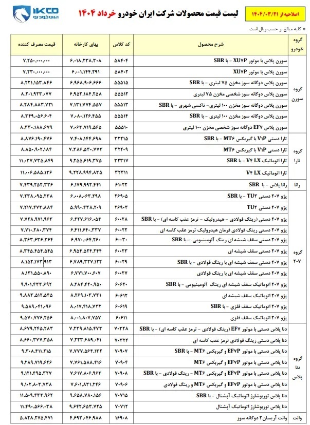 به گزارش ایرنا، بر این اساس قیمت خودروها در ۶ گروه خودرویی از جمله سورن، تارا، رانا، پژو ۲۰۷، دنا پلاس و وانت بار اعلام شد.
