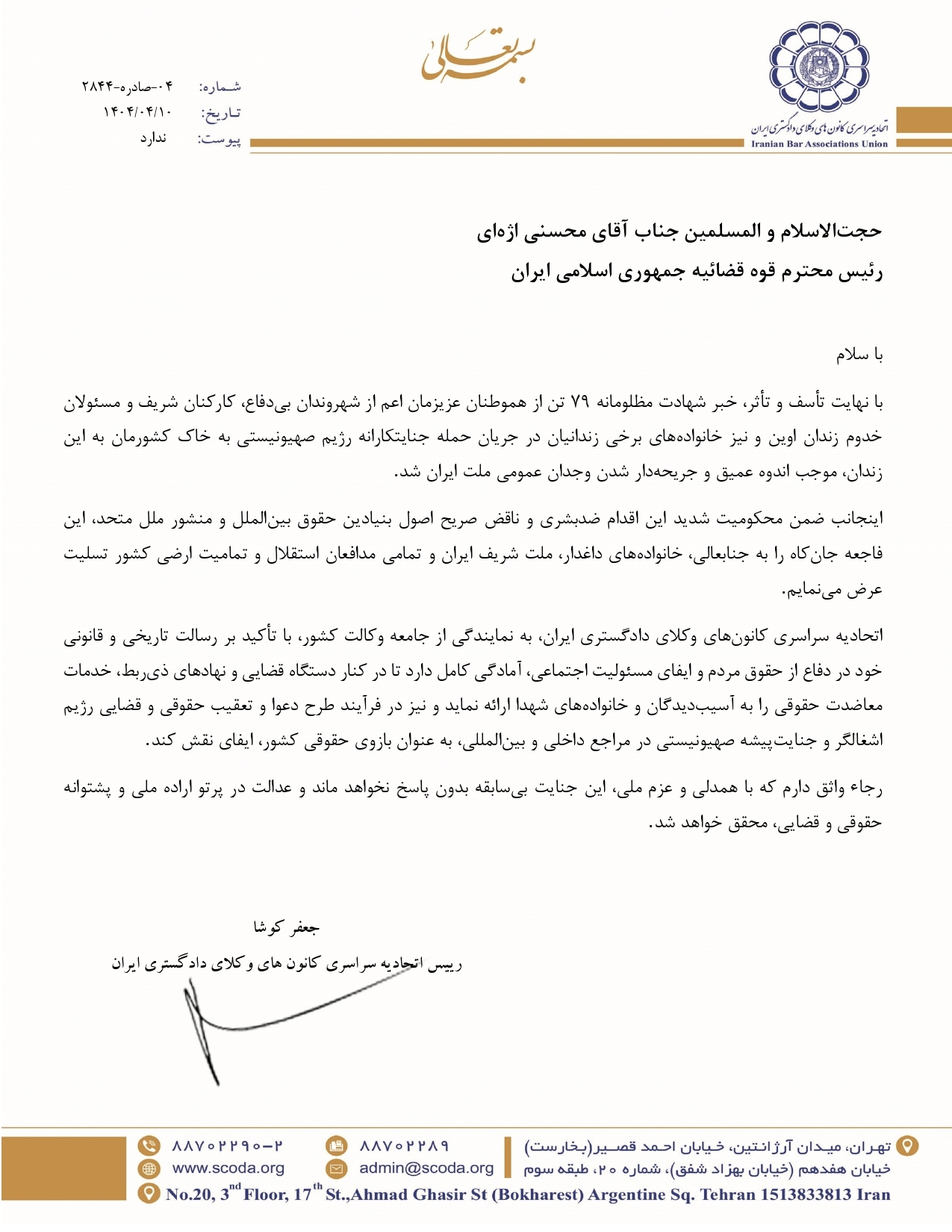 رویداد۲۴| به گزارش روابط عمومی اسکودا، متن کامل نامه دکتر جعفر کوشا، رئیس اتحادیه سراسری کانونهای وکلای دادگستری ایران خطاب به حجتالاسلام و المسلمین محسنی اژهای، رئیس قوه قضائیه به این شرح است: