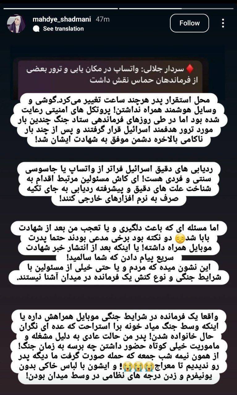 آیا جاسوس اسرائیل واقعاً در جیب فرماندهان سپاه بود؟ | دختر سردار شادمانی: مساله فراتر از واتساپ است