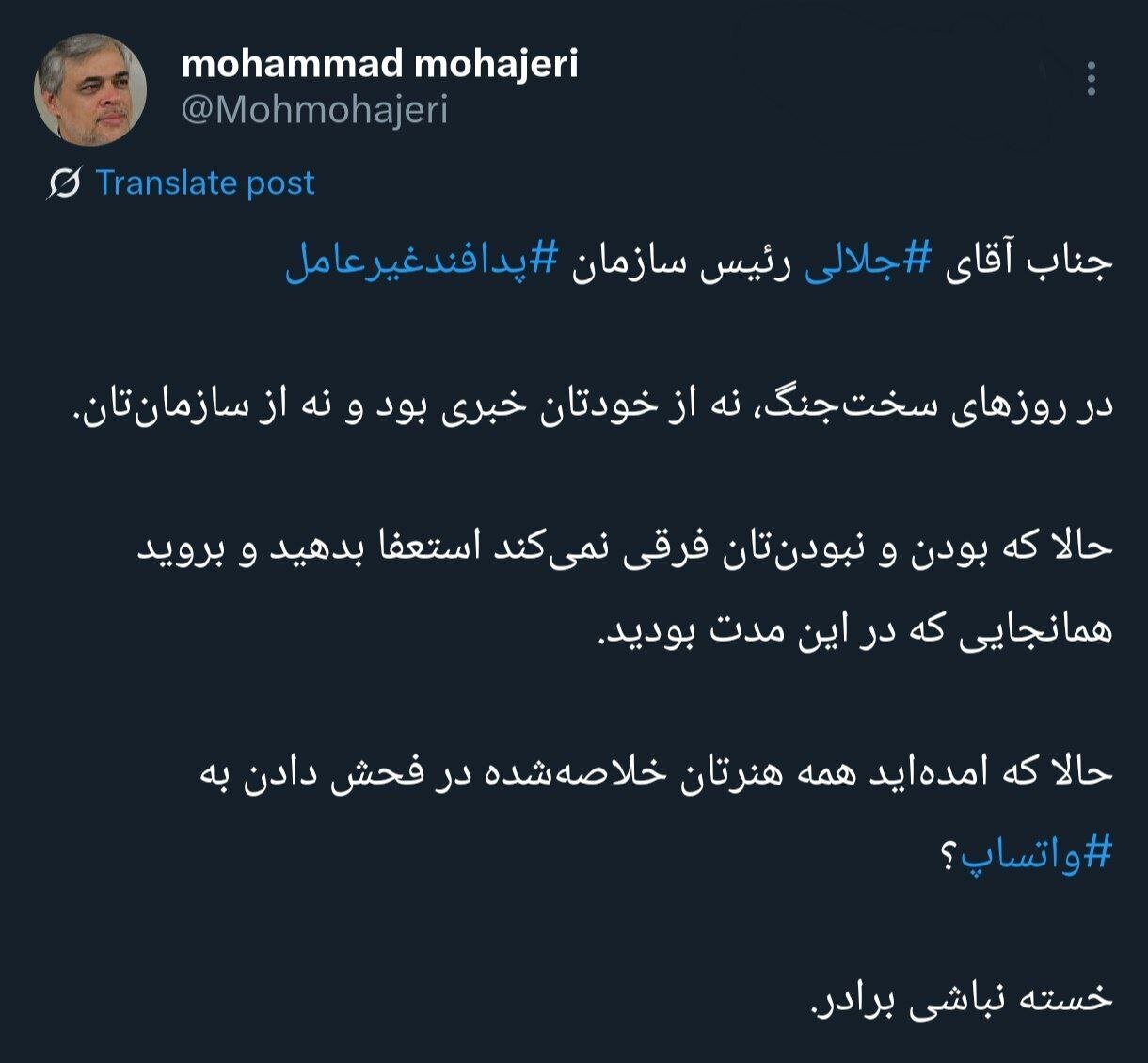«جناب آقای جلالی رئیس سازمان پدافند غیر عامل ، در روزهای سخت جنگ نه از خودتان خبری بود نه از سازمان تان. حالا که بود و نبودتان فرقی نمی کند، استعفا بدهید و بروید. همان جایی که در این مدت بودید.»