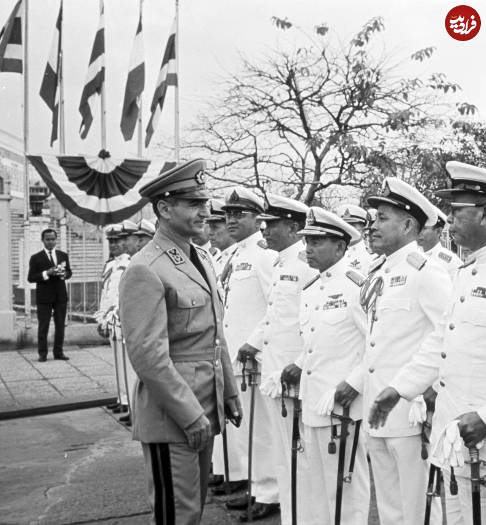 در ادامه تصویری کمتر دیده شده از محمدرضا پهلوی را در سفر تایلند و در حال دیدار با فرماندهان نظامی این کشور در سال ۱۳۴۶ مشاهده میکنید.