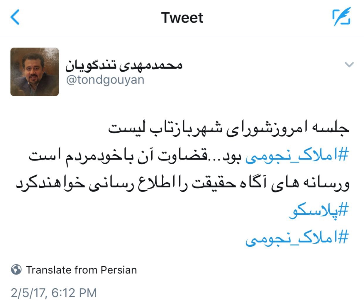 توئیت معنادار سخنگوی اصلاحطلبان شورایشهر درباره ارتباط پلاسکو و املاکنجومی