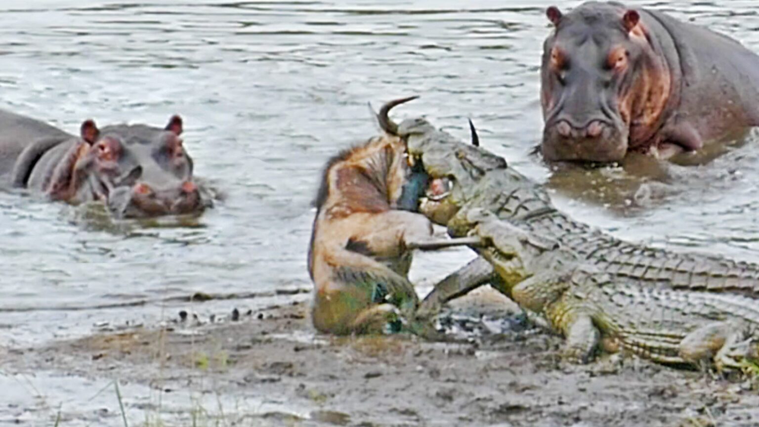 اسبهای آبی که نظاره گر این صحنه بودند به نظر می رسید از آنچه در نزدیکی شان اتفاق میافتاد بسیار آشفته شده اند. آنها تصمیم گرفتند در این ماجرا دخالت کنند. ورود اسب های آبی به این کشمکش موجب آزادشدن گوزن و فراری شدن کروکدیل ها شد.