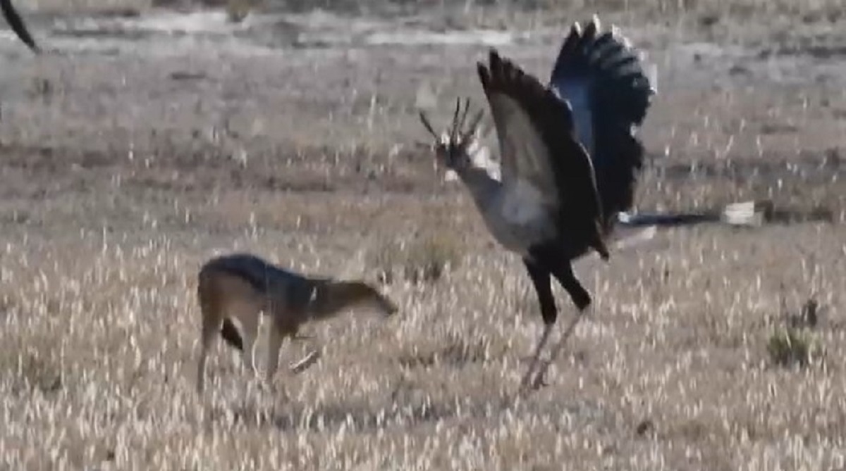 گردشگران پارک ملی کروگر شاهد جدال دیدنی یک مرغ دبیر با شغال بودند.